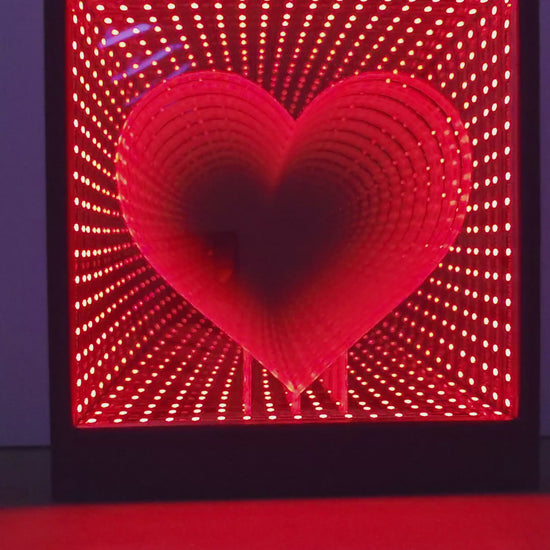 Unlike standard infinity mirrors, this frame features a "Middle Slot." You can add custom inserts that you create or you purchase from my shop. This will let you customize the Infinity Mirror for your own transparent art, vinyl cutouts, or logos between the mirrors (see the fish photo for an example!). The result? Your design floats in 3D space inside the tunnel.